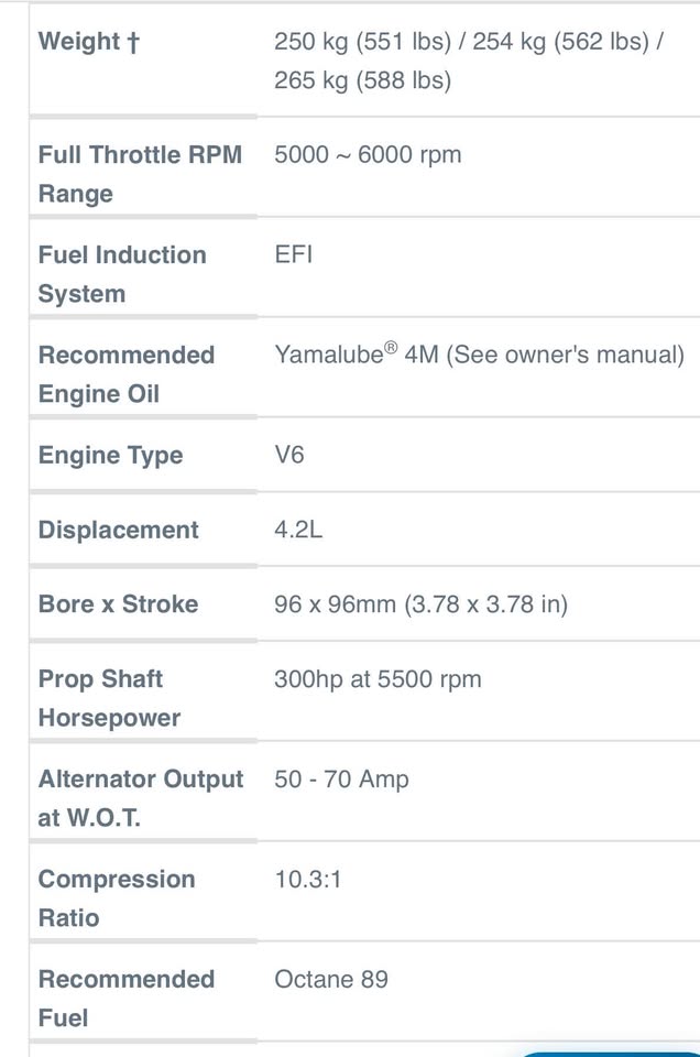 The award-winning 4.2-liter F300 is the king of our V6’s. Weighing in at 562 pounds (digital) and 551 pounds (mechanical), it’s up to 73 pounds lighter than some competitors. Plus, it’s up to 19 percent faster at cruise RPM*. It’s easy to see why it’s the top choice for offshore performance.